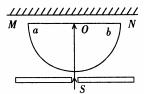 [例6]如图所示,MN是位于竖直平面内的光屏,放在水平面上的半圆柱形玻璃砖的平面部分ab与屏平行.由光源S发出的一束白光从半圆沿半径射入玻璃砖,通过圆心O再射到屏上.在水平面内以O点为圆心沿逆时针方向缓缓转动玻璃砖,在光屏上出现了彩色光带.当玻璃砖转动角度大于某一值,屏上彩色光带中的某种颜色的色光首先消失.有关彩色的排列顺序和最先消失的色光是 ( )