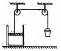 如图所示,导热性能良好的气缸内用活塞封闭着一定质量、常温常压的气体,气缸固定不动。一条细绳一端连接在活塞上,另一端通过两个光滑的定滑轮后连接在一个小桶上,开始时活塞未静止。现不断向小桶中添加细沙,使活塞缓慢向上移动(活塞始终未被拉出气缸、周围环境温度不变)。则在活塞移动的过程中,下列说法正确的是 ( )