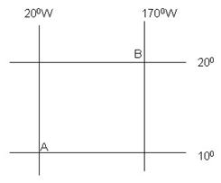 解析:先确定南北方位,由于纬度的分布规律是越往北走纬度越高,因此该区域为北半球,然后确定东西方位,确定东西方位时要注意两条经线之间的的经度差,在本题中由于两条经线之间的经度差为2100,因此A在B的东北方位。