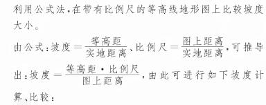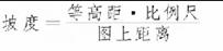 在等高线地形图中,坡度是指山坡的倾斜角度。通常用坡面与水平面所成的二面角来表示。如图中α角。α角大小的衡量可采用数学三角函数的正切函数进行表示,即tgα(0°≤0≤90°)。因为正切函数在区间(0,π/2)为单增曲线。所以可用比值进行比较。H表示坡高(即相对高度),与等高线地形图中等高距有关系。L表示坡宽(坡宽=图上距离/比例尺)。坡度α的大小就可以用等高距与比例尺的关系进行表示。