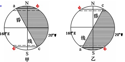 ①提取图中的有效信息→昏线与160ºE经线相交于a 点,与20ºW相交于c点。
