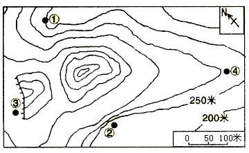 11.甲组队员准备在图示地区宿营,为避免突发的山洪,你认为在①②③④四地中,最不适宜宿营的地点是 ( )