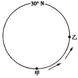 下图是300N纬线圈,一架客机于当地日出时间4时10分从甲地(1200E)起飞,沿纬线飞行,方向如图中箭头所示,到达乙地(1500W)时正值日落,据此完成13-14题。