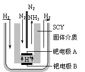 (4)近年来科学家提出了电解合成氨的方法:采用高质子导电性的SCY陶瓷(能传递H+)为介质,用吸附在它内外表面上的金属钯多晶薄膜做电极,实现了高转化率的电解法合成氨(装置如右图)