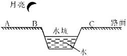 33、一个雨过天晴的夜晚,小刚在晚自习回家的路上,看见了路面水坑中一个弯弯的“月亮”,下图是当时场景的示意图。请你指出:①小刚他可能站在__________(选填“A、B、C”);②在图上画出小刚看见的“月亮”。