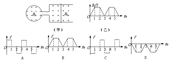 21.如图(甲)所示,圆形金属框与一个平行金属导轨相连接,并置于水平桌面上.圆形金属框面积为S,内有垂直于线框平面的磁场,磁感应强度B1随时间t的变化关系如图(乙)所示,0-1s内磁场方向垂直线框平面向里.长为L,电阻为R的导体棒置于平行金属导轨上,且与导轨接触良好.导轨和导体棒处于另一匀强磁场中,其磁感应强度恒定为B2,方向垂直导轨平面向里。若不计其余各处的电阻,当导体棒始终保持静止时,其所受的静摩擦力f(设向右为力的正方向)随时间变化的图象为( )