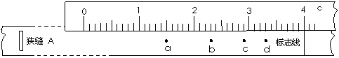 稳定转动后,开始喷漆。仅当狭缝A和B正对平行时,雾滴才能在纸带内侧留下痕迹。改变喷射速度重复实验,在纸带上留下了一系列的痕迹 a、b、c、d。将纸带取下放在刻度尺下(如下图)。