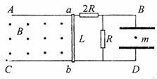 可在导轨上无摩擦地滑动。棒与导轨垂直,并接触良好。导轨之间有垂直纸面向外的匀强磁场,磁感强度为B。导轨右边与电路连接。电路中的两个定值电阻分别为2R和R。在BD间接有一水平放置的平行板电容器C,板间距离为d。当