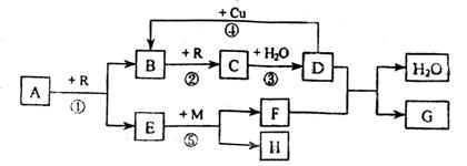 20.(14分)A、B、C、D、G都是含有同一种短周期元素的化合物,E是氧化物,H是单质,D是常见的强酸,反应①、②、③是工业生产中的重要反应,根据下图转化关系(反应条件及部分产物已略去)填空: