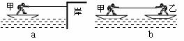 5、图a、b所示的两个情景中,静水中原先静止的甲、乙两船,质量相同,两船上的人的质量也相同。站在船上的甲人以同样大小的力拉绳相同的时间t(未发生碰撞),不计水的阻力,则( )