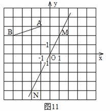 (8分)如图11,在方格纸上建立平面直角坐标系,线AB的两个端点都在格点上,直线MN经过坐标原点,且点M的坐标是(1,2)。
