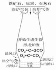 (2)煤的加工产品有很多用途,其中焦炭广泛应用于炼铁。右图是高炉炼铁的示意图。请根据图例回答: