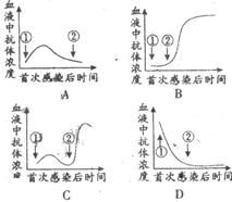 (6)能正确表示病毒侵入体后,引起血液中抗体浓度变化的是(①表示第一次感染,②表示第二次感染)( )