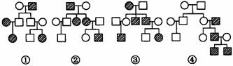 以下家系图中属于常染色体隐性遗传、Y染色体遗传、X染色体显性遗传、X染色体隐性遗传的依次是( C )