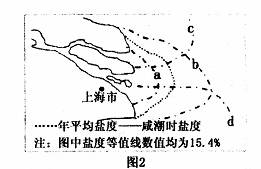 咸潮,又称咸潮上溯、盐水入侵,内河含盐量超过一定标准,水体变咸即形成咸潮,近年来某些河口三角洲地区由于咸潮问题凸显,受到广泛关注。2010年,上海将举办举世瞩目世博会,“城市,让生活更美好”的主题己深入人心。然而,目前上海的城市供水现状却令人担忧:夏季的用水高峰和冬春咸潮造成全市供水趋紧。而近年,上海先后经受了近10次咸潮侵袭,影响程度为历年之最。据此并结合图2回答3-4题。