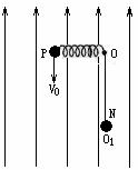25.(09年四川卷)(20分)如图所示,轻弹簧一端连于固定点O,可在竖直平面内自由转动,另一端连接一带电小球P,其质量m=2×10-2 kg,电荷量q=0.2 C.将弹簧拉至水平后,以初速度V0=20 m/s竖直向下射出小球P,小球P到达O点的正下方O1点时速度恰好水平,其大小V=15 m/s.若O、O1相距R=1.5 m,小球P在O1点与另一由细绳悬挂的、不带电的、质量M=1.6×10-1 kg的静止绝缘小球N相碰。碰后瞬间,小球P脱离弹簧,小球N脱离细绳,同时在空间加上竖直向上的匀强电场E和垂直于纸面的磁感应强度B=1T的弱强磁场。此后,小球P在竖直平面内做半径r=0.5 m的圆周运动。小球P、N均可视为质点,小球P的电荷量保持不变,不计空气阻力,取g=10 m/s2。那么,