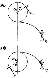 当B的方向垂直纸面朝里时,P、N的速度相同,同样由图,有: