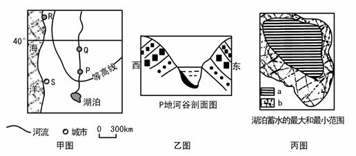 42. (8分)下图中,图甲为某区域示意图,图乙反映图甲中的P地河谷剖面,P地河谷剖面的形成与地转偏向力的作用有关,图丙反映图甲对应的湖泊情况。据图回答下列问题。