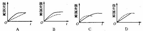 17. 将一定质量块状的碳酸钙与足量的盐酸反应,反应体系内损失的质量随时间t的变化曲线如图中的实线所示。在相同条件下,再取相同质量粉末状碳酸钙与同浓度的盐酸反应,则相应的曲线如图中的虚线所示。其中正确的是
