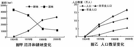 图甲和图乙表示黑龙江省同江市(位于松花江与黑龙江的交汇处)沼泽、耕地及人口的变化,据此完成17-18题。