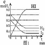2HI(g) △H<0。反应中各物质的浓度随时间变化情况如图1: