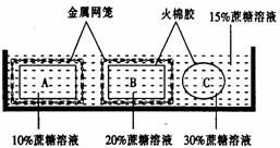 27.“人造细胞”是用羊皮纸或火棉胶等半透性膜材料做成的一个密闭的囊,囊里面装了等量的不同浓度的蔗糖溶液。假设有三个这样的“人造细胞”,分别用A、B、C表示,他们的蔗糖溶液浓度分别是10%、20%和30%.其中A、B细胞的外面套一金属网笼,C细胞的外面没有套金属网笼,如图。