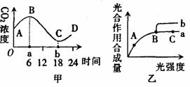 (8分)右图甲表示春季晴天某密闭大棚内一昼夜CO2浓度的变化。乙图曲线a表示某种植物在20℃、CO2浓度为0.03%的环境中随着光强度的变化光合作用合成量的变化;在B点时改变某种条件,结果发生了如曲线b的变化。请分析回答: