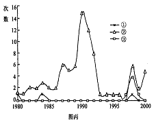 (2)、图丙为1980-2000年图甲中①、②、③三地各年赤潮发生次数曲线图,试分析②地赤潮发生次数多的原因______________________________。(4分)