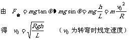 [例10]设火车转弯时,弯道处内外轨高度差为h,内外轨间距L,转弯半径R.对一个固定的弯道来说,正常的行驶速度是一定的.当火车转弯时行驶速率不等于v0时,其向心力的变化可由内外轨道对轮缘侧压力自行调节,但调节程度不宜过大,以免损坏轨道。试分析轨道对轮缘侧压力与行驶速率v的关系.