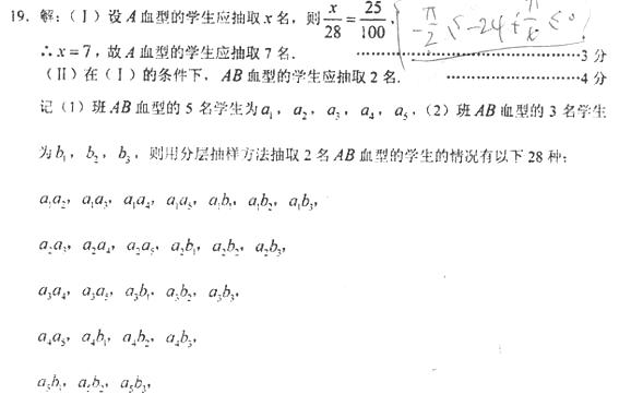 (Ⅱ)在AB血型的8名学生中,(1)班5名、(2)班3名。在(Ⅰ)的条件下抽取AB血型的学生,用列举法求(1)、(2)两个班都有AB血型的学生被抽中的概率![]()