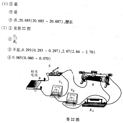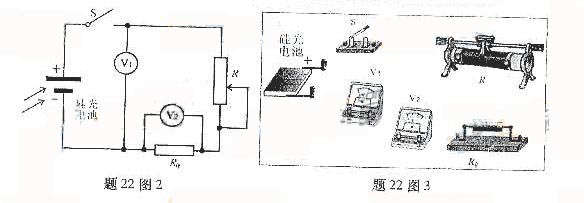 (2)硅光电池是一种可将光能转换为电能的器件。某同学用题22图2所示电路探究硅光电池的路端电压U与总电流I的关系。图中R为已知定值电阻。电压表视为理想电压表。