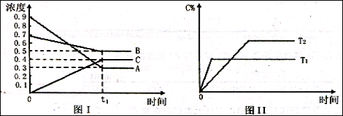 12.T℃时A气体与B气体反应生成C气体。反应过程中A、B、C浓度(mol/L)随时间变化如图I所示;若保持其他条件不变,温度分别为T1和T2时,C的体积分数与时间的关系如图Ⅱ所示。下列结论正确的是