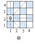 国际象棋、中国象棋和围棋号称为世界三大棋种.国际象棋中的“皇后”的威力可比中国象棋中的“车”大得多:“皇后”不仅能控制她所在的行与列中的每一个小方格,而且还能控制“斜”方向的两条直线上的每一个小方格.如图甲是一个4×4的小方格棋盘,图中的“皇后Q”能控制图中虚线所经过的每一个小方格.