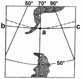 右图中有世界最宽的海峡,bac为晨昏线。回答6-8题。![]()