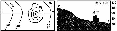 下图中,左图为潜水位等值线图,右图表示右图中XY两地间的剖面图。回答15-16题。![]()