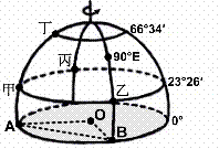 右图中,O为地心,AB与地球的半径等长。此时甲地的太阳高度角为一年中的最大值。据此回答25-27题。![]()
