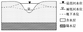34.下列四幅图中能正确反映河水位与地下水位关系的是