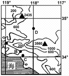 (1)C与图中较远处山峰的直线距离约为 千米。从A到B的地势变化是 。(2分)