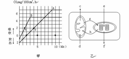 甲表示两种不同的植物(阳生植物和阴生植物)随着日光照射强度的变化,吸收CO2量与放出CO2量的变化曲线图,图乙表示某植物细胞的部分细胞结构和相关代谢情况,c-h指的是O2或CO2。请据图回答:
