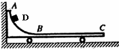 (2)(10分)如图所示,小车质量为M=2.0kg,带有光滑的圆弧轨道AB和足够长的粗糙水平轨道BC,一小物块(可视为质点)质量为m=0.5kg,与水平轨道BC的动摩擦因数为μ=0.1。现将小车置于光滑水平面上,小车左端紧靠竖直墙壁,若小物块从距水平轨道BC高为0.8m的D点由静止释放, 试求小物块能在水平轨道BC上滑行的最大距离(重力加速度g=10m/s2)。