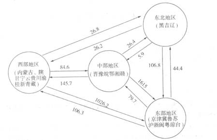 图9我国四大地区之间人口流动示意图(单位:万人 2000年)