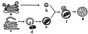 1.下图示溶酶体发生过程和“消化”功能。b 是刚形成的溶酶体,它起源于细胞器a,e 是由膜包裹着衰老细胞器d 的小泡,它的膜来源于细胞器c。以下叙述不正确的是( )
