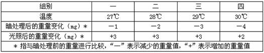 26.(18分)用某种大小相似的农作物绿色叶片,分组进行实验:已知叶片实验前的重量,在不同温度下分别暗处理1小时,测其重量变化;立刻再光照1小时(光强度相同),再测其重量变化。得到如下结果: