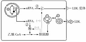 27.(15分)人体内胆固醇含量的相对稳定对健康有重要意义。胆固醇是血浆中脂蛋白复合体的成分,一种胆固醇含量为45%的脂蛋白(LDL)直接影响血浆中胆固醇的含量。LDL可以与细胞膜上的LDL受体结合,通过胞吞作用进入细胞,之后LDL在溶酶体的作用下释放出胆固醇。当细胞中胆固醇含量较高时,它可以抑制酶的合成和活性,也可以抑制LDL受体的合成。请结合下图细胞中胆固醇来源的相关过程回答:
