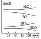 ⑵海水中的氘(含HDO 0.03‰)发生聚变的能量,足以保证人类上亿年的能源消费,工业上可采用“硫化氢-水双温交换法”富集HDO。其原理是利用H2S、HDS、H2O和HDO四种物质,在25℃和100℃两种不同的温度下发生的两个不同反应得到较高浓度的HDO。上图为“硫化氢-水双温交换法”所发生的两个反应中涉及的四种物质在反应体系中的物质的量随温度的变化曲线。写出100℃时所发生反应的化学方程式 ;工业上富集HDO的生产过程中,可以循环利用的一种物质是 。