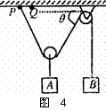如图4所示,由物体A和B组成的系统处于静止状态。A、B的质量分别为mA和mB,且mA>mB。滑轮的质量和一切摩擦可不计。使绳的悬点由P点向右移动一小段距离到Q点,系统再次到达静止状态。则悬点移动前后图中绳与水平方向间的夹角θ将( )
