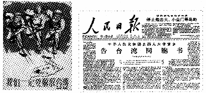 21.1979年,全国人大常委会发表《告台湾同胞书》,宣布采用和平方式统一祖国的方针。下面两图的转变,可以说明![]()