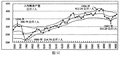 材料一 图12为我国人均粮食产量变化图,图中人均粮食产量围绕着趋势线在一个通道内波动,从中间的趋势线到通道边沿的宽度,即为平均的波幅,平均波幅与趋势值之比,表示粮食产量的稳定性高低。波幅越大,粮食产量越不稳定。
