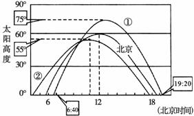 这一天北京时间12时整,①、②两地观测到太阳方向分别是
