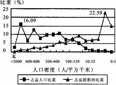 下图是我国基于密度分级的人口和面积比重图,完成1-2题。